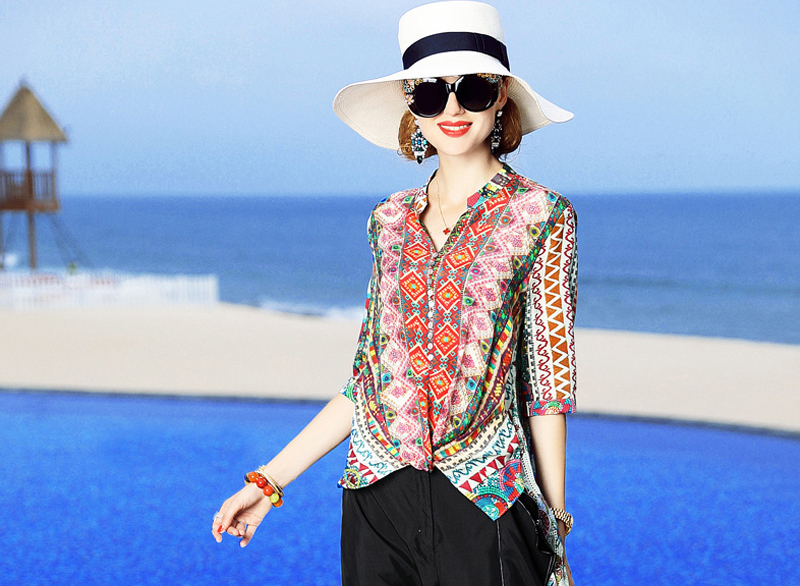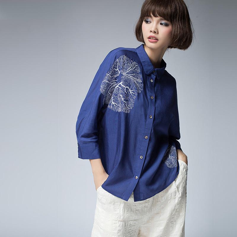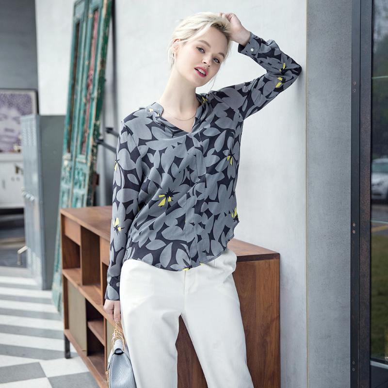 深蓝的衬衫是比较受到白领们喜爱的一款,。既不显得打扮老土,又能恰到好处的彰显自己的个性,再加上印花的点缀,时尚感和干练感兼备。