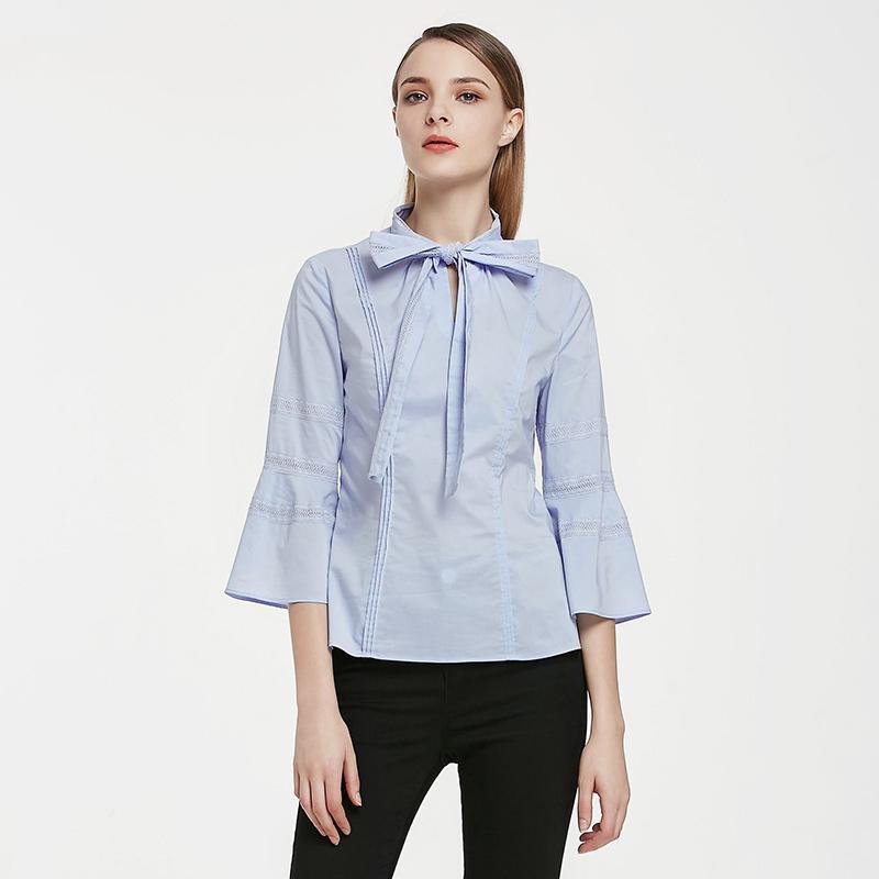 非常独特的一件衬衫,浅蓝的颜色满满的清新又不失时尚感。喇叭袖的设计时尚又能遮肉,效果满分。领口的小领带和蝴蝶结则是设计感发挥到了巅峰,个性又时尚。