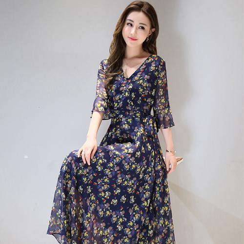 这款颜色上就比较的的鲜艳了,穿着很显皮肤白,v领的设计显得很有女人味而且还透露着一丝性感,雪纺的面料轻盈透气不会感觉到闷热,花朵的样式显得很梦幻,喇叭袖口的设计显得很甜美,端庄大气里透露着一丝甜美,显得很有女生的气质。