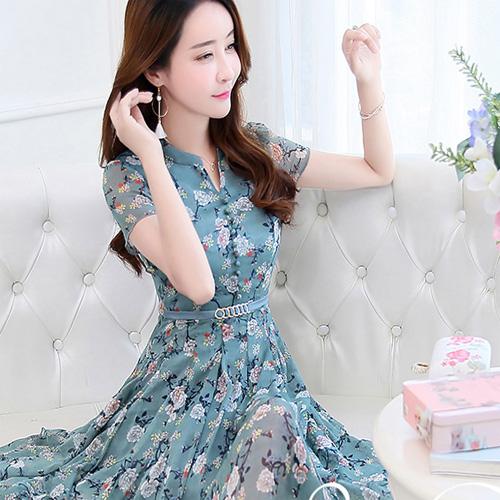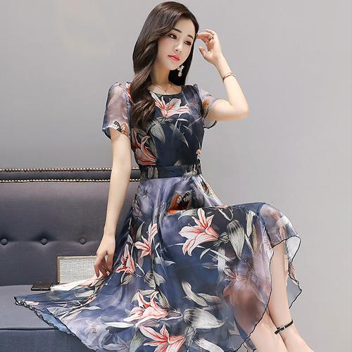 这款给人的感觉就是比较的沉静了,端庄大气给人一种冷艳的感觉,圆领的设计亲和随性,很休闲的感觉,颜色比较静,在夏季给人带来一丝凉爽,大花朵的图案,上面是百合花,代表着纯净青春,腰带的水不会带来压迫,展现女生的好腰身。