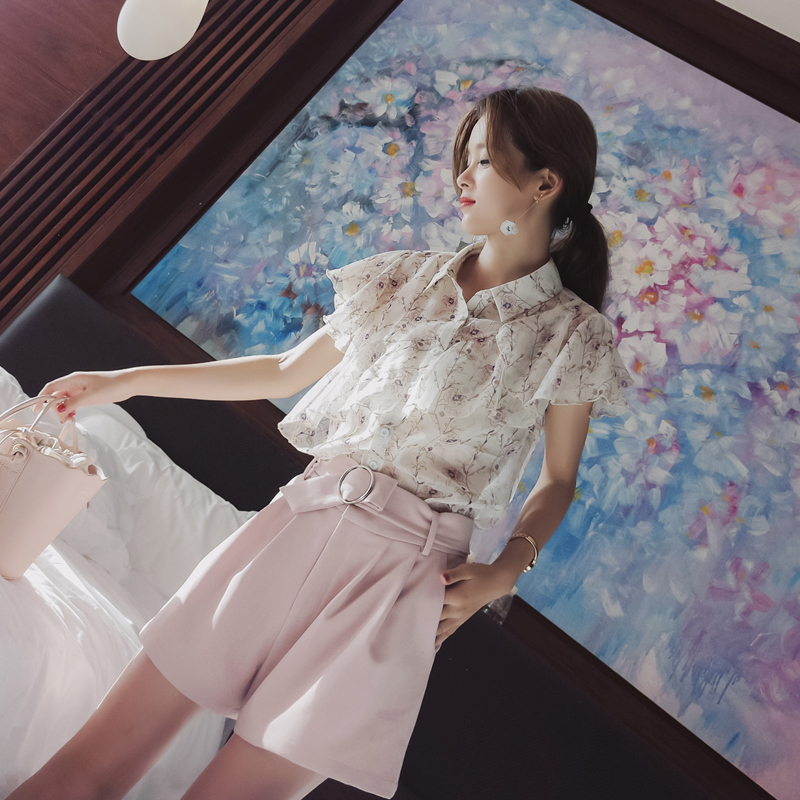 谜秀 雪纺衫衬衫女2017夏装新款韩版短袖碎花荷叶边女装上衣潮