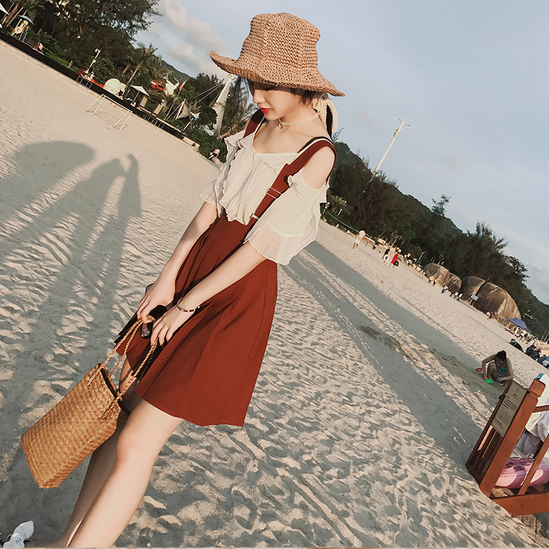 谜秀 背带裙女夏2017夏装新款韩版纯色学生短裙休闲百褶裙连衣裙