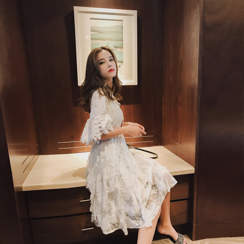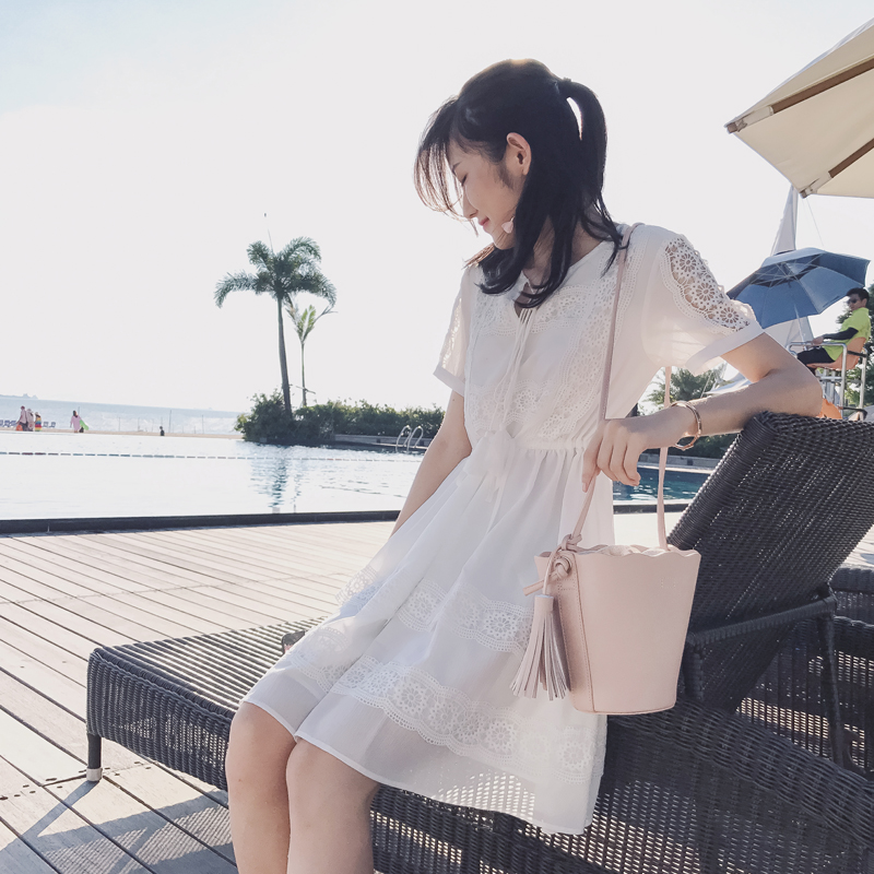 雪纺连衣裙女夏2017夏装新款韩版纯色V领甜美宽松勾花镂空A字裙子