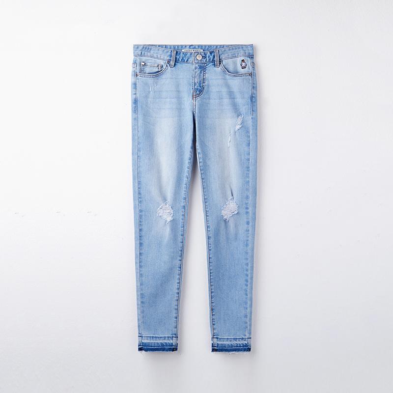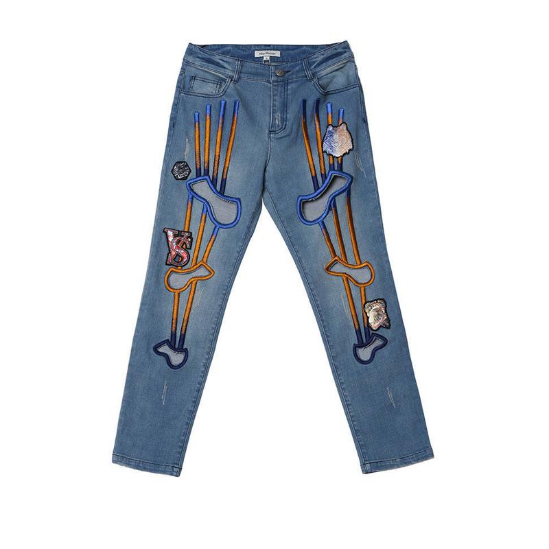 精致刺绣,融合于破洞之中,不羁的街头风中,带上了更多的独特个性魅力。小脚裤更显时尚。