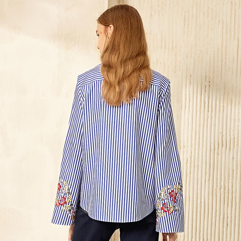 推荐理由: 经典条纹翻领衬衫 文艺大气 拥有素心的女子都不爱穿得俗艳,她们很清楚,只需一件白衬衫配条花裙子就足够打动人心了。小小的半开领内敛、端庄,很衬文艺女生的气质。袖子外侧印着淡淡的民族风花卉图案,配上收紧式袖口尤显品味。