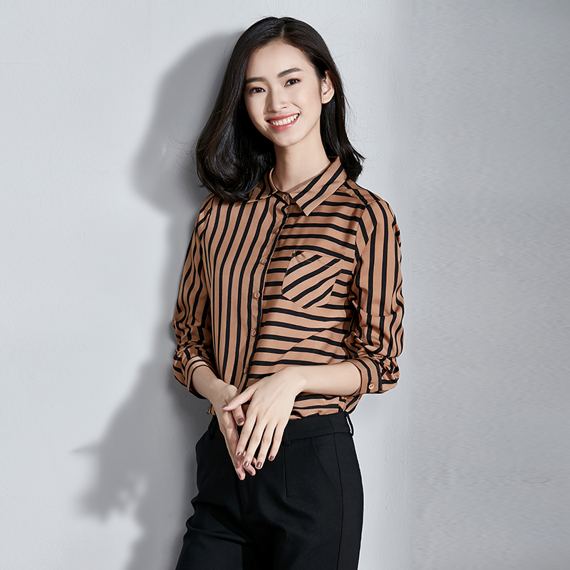 推荐理由: 休闲中蕴含着正式,细节又不落俗套,越看越有味的一款。撞色翻领和袖口巧妙提升视觉吸引力,衣下摆两侧的不规则设计更是一扫平庸,令它无论从哪个角度看都那么拉风养眼。 气质条纹 休闲衬衫 让你无需再为小肚腩和粗大腿而担心,轻轻松松地将最美的一面展现给众人。