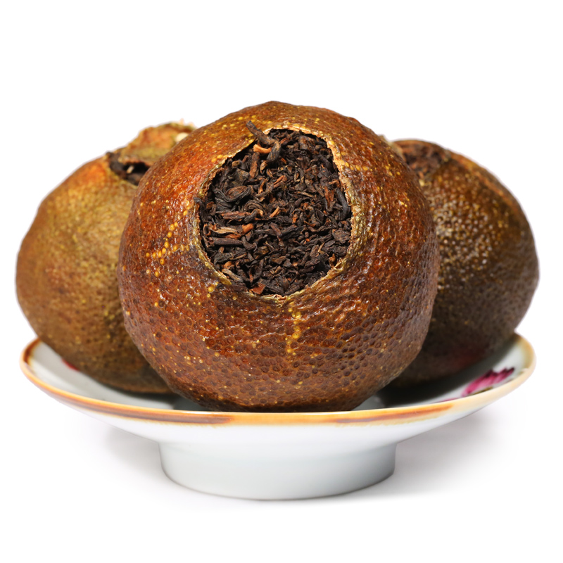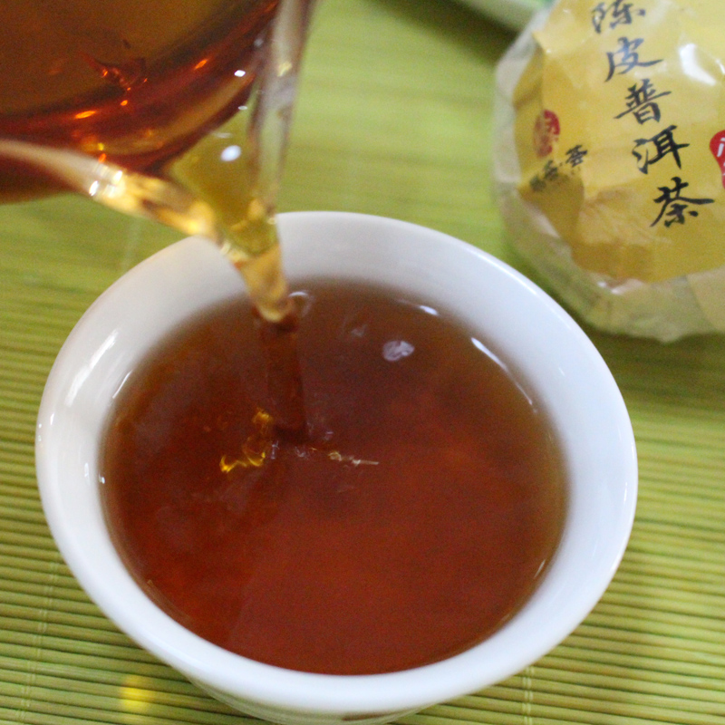 柑皮有祛湿邪、破滞气、疏经通络、暖人脏腑之妙;普洱熟茶,茶性温和,可暖胃、生津、提神、解毒。
